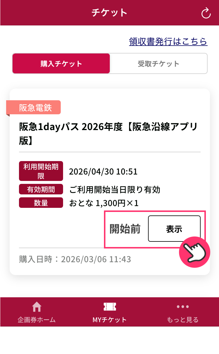 2「チケット」画面で利用したいチケットの「表示」をタップします。