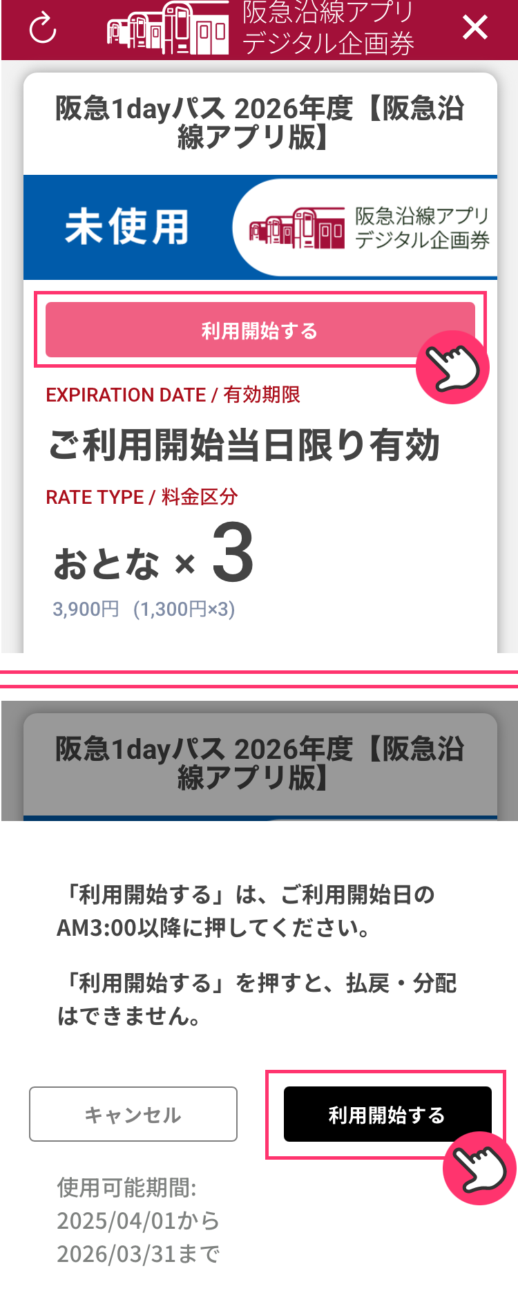 3チケットの内容を確認し、「利用開始する」をタップし、ポップアップ画面の「利用開始する」をタップします。