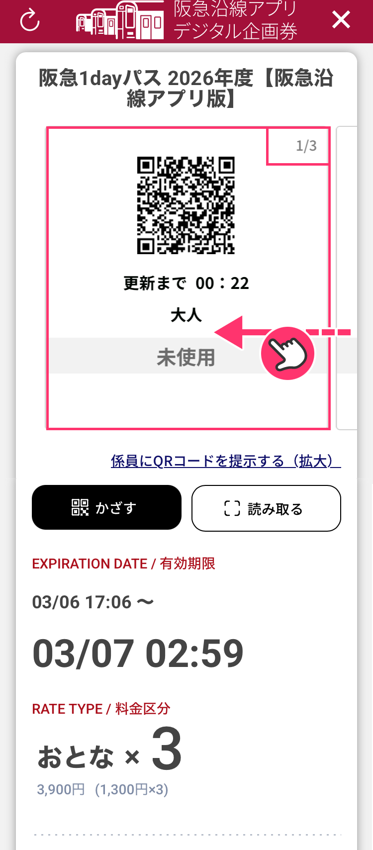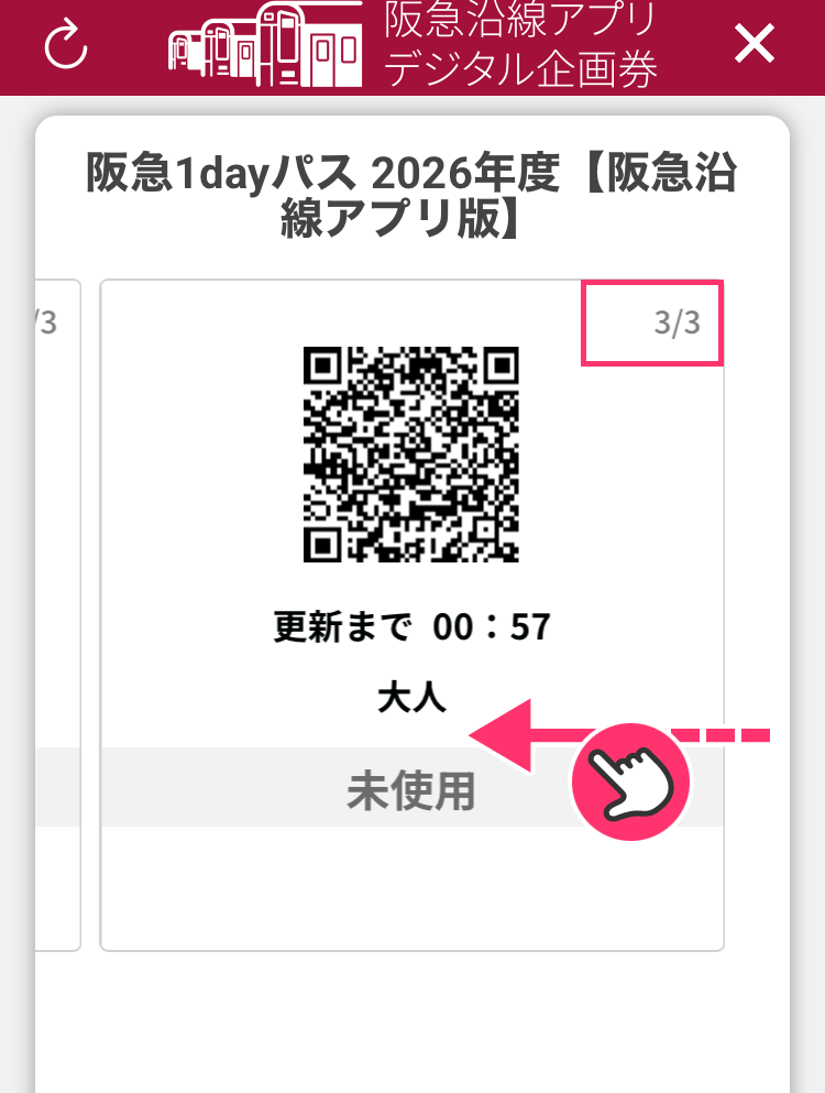4チケット購入者が、表示されたチケットのQRコードを改札にかざします。同行者を先に入場させてください。QRコードを左にスワイプする事で次のチケットを表示できます。(1人につき1枚必要)