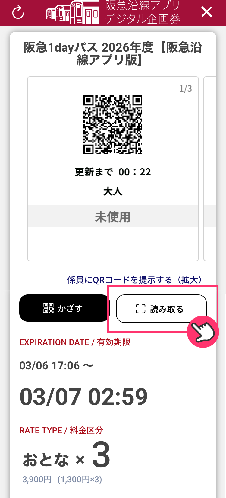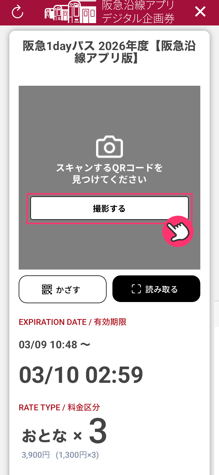 5「撮影する」の後で表示されたデジタルチケット画面を係員へ見せます。購入者は最後に改札を通ってください。