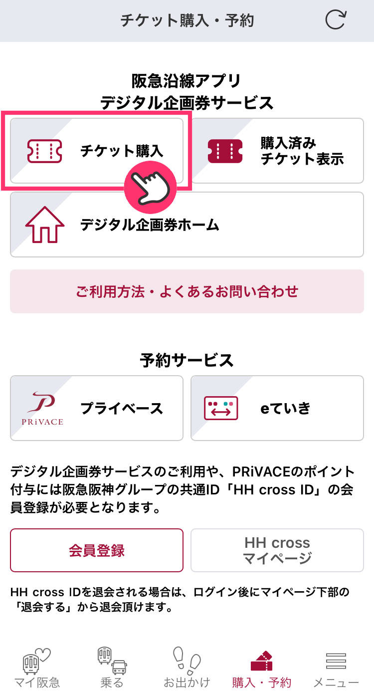 1画面下部の「購入・予約」をタップして「チケット購入・予約」画面を開き、画面左上の「チケット購入」をタップします。