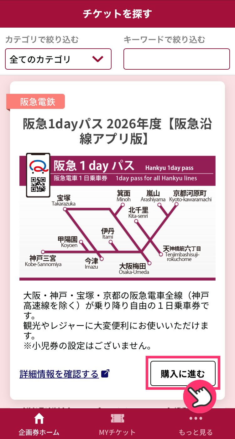 2「チケットを探す」ページをスクロールして、購入したいチケットの「購入に進む」をタップします。