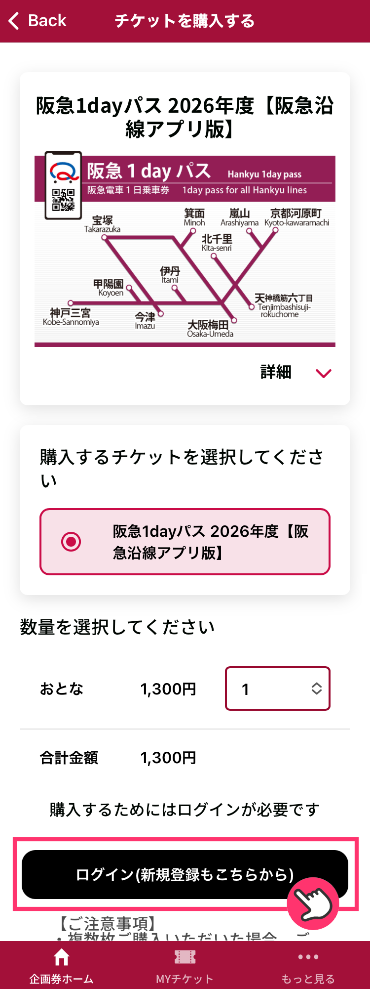 3購入するチケット、数量を選択して「ログイン(新規登録はこちら)」をタップします。