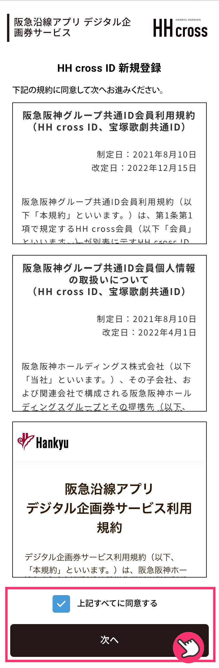 5各利用規約をご確認いただき、「上記すべてに同意する」にチェックいただき、「次へ」をタップします。