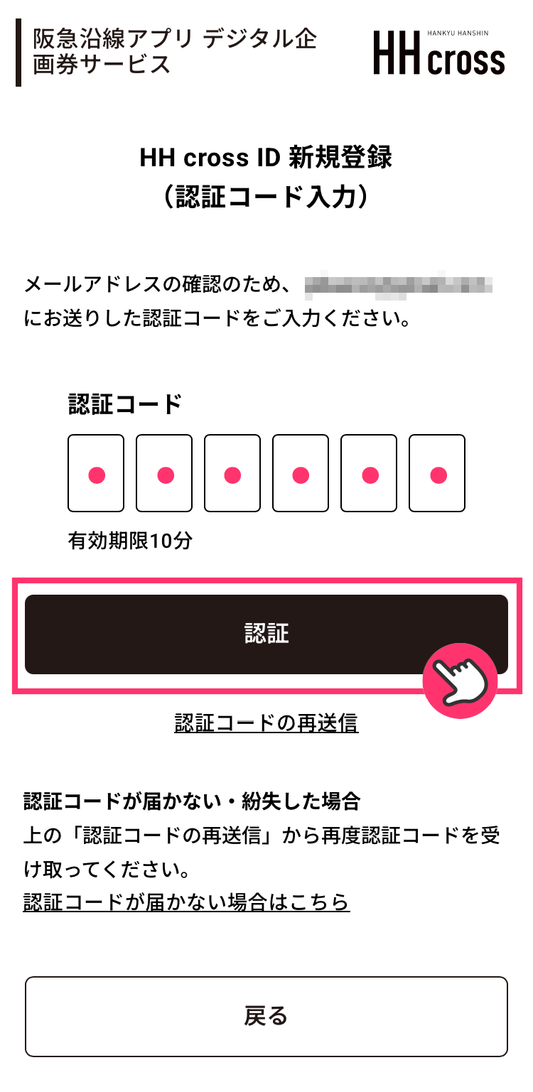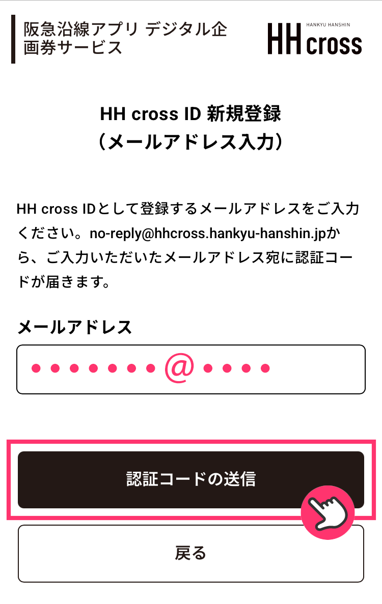 6HH cross IDとして登録いただくメールアドレスを入力して、「認証コードの送信」をタップします。