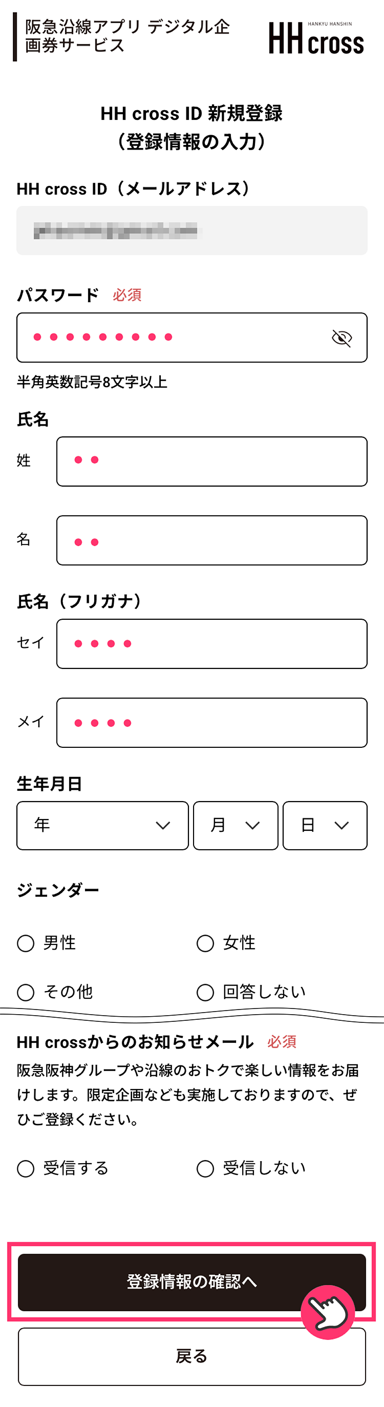 8パスワードや氏名などの登録情報を入力して「登録情報の確認へ」をタップします。