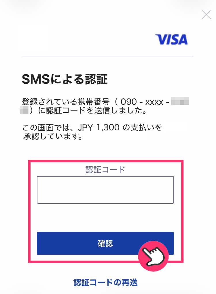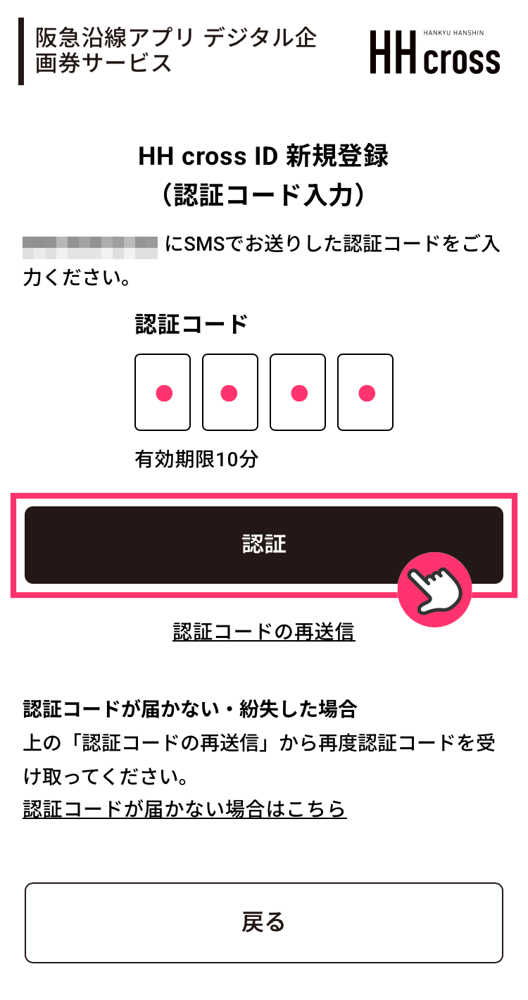 10登録いただいた電話番号にショートメッセージでお送りする4桁の認証コードを入力して「認証」をタップします。