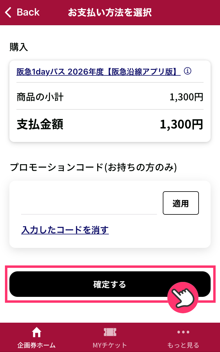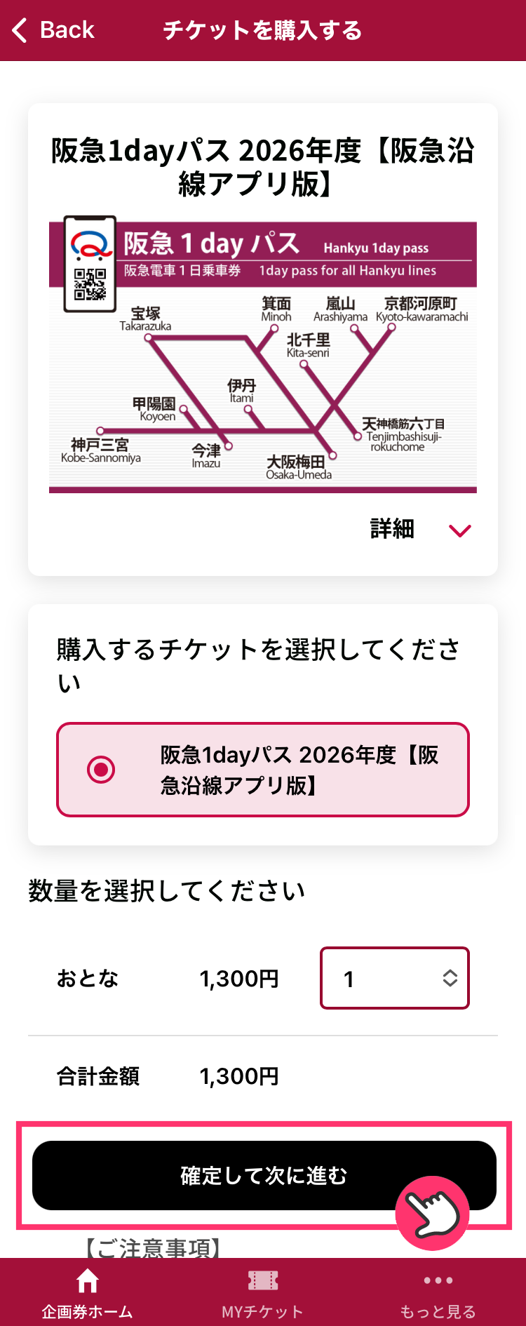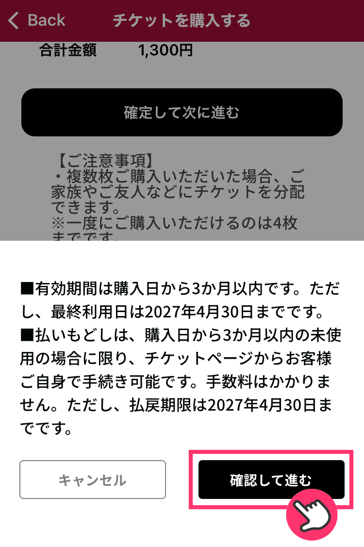 12購入チケット、数量を確認の上「確定して次に進む」をタップし、ポップアップ画面の「確定して進む」をタップします。