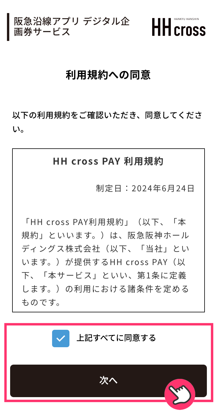 15各利用規約をご確認いただき、「上記すべてに同意する」にチェックいただき、「次へ」をタップします。