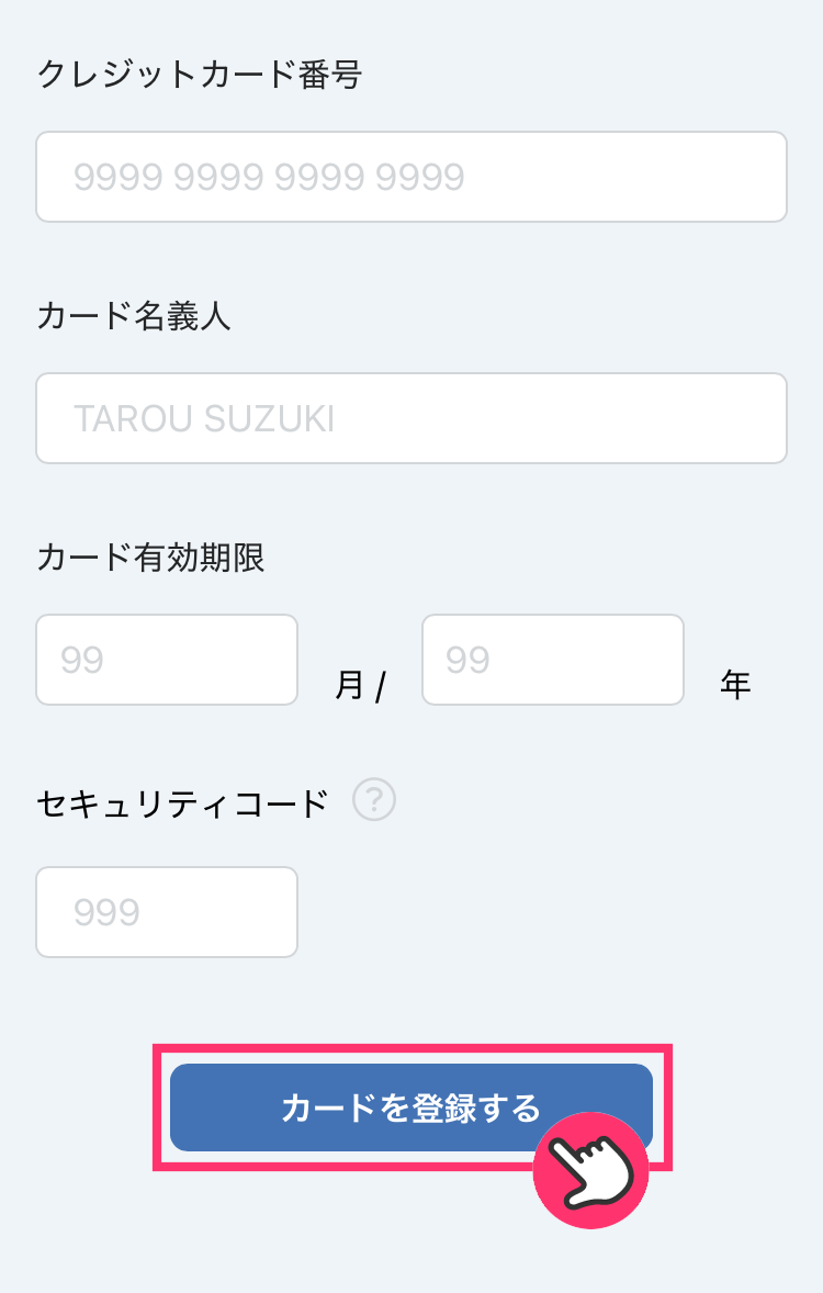 17クレジットカード情報の登録を行い、「カードを登録する」をタップします。