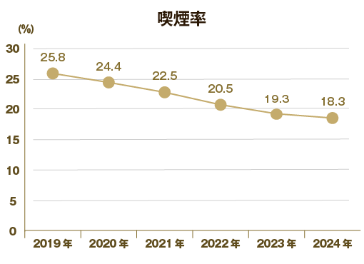 当社は、喫煙の害に関するリテラシー教育や禁煙支援、職場環境の整備など様々な施策を実施し、禁煙を推進しています。2024年度からは、当社で働くすべての従業員の健康を守るために、勤務時間中および職場敷地内を禁煙化しています。