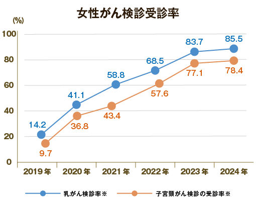 2023年より定期健康診断と同日にがん検診を受けられるように健診体制を見直しました。2024年度のがん検診受診率は、乳がん検診が85.5%、子宮頸がん検診が78.4%となり、今後もさらなる受診率維持向上のため、取組を強化します。